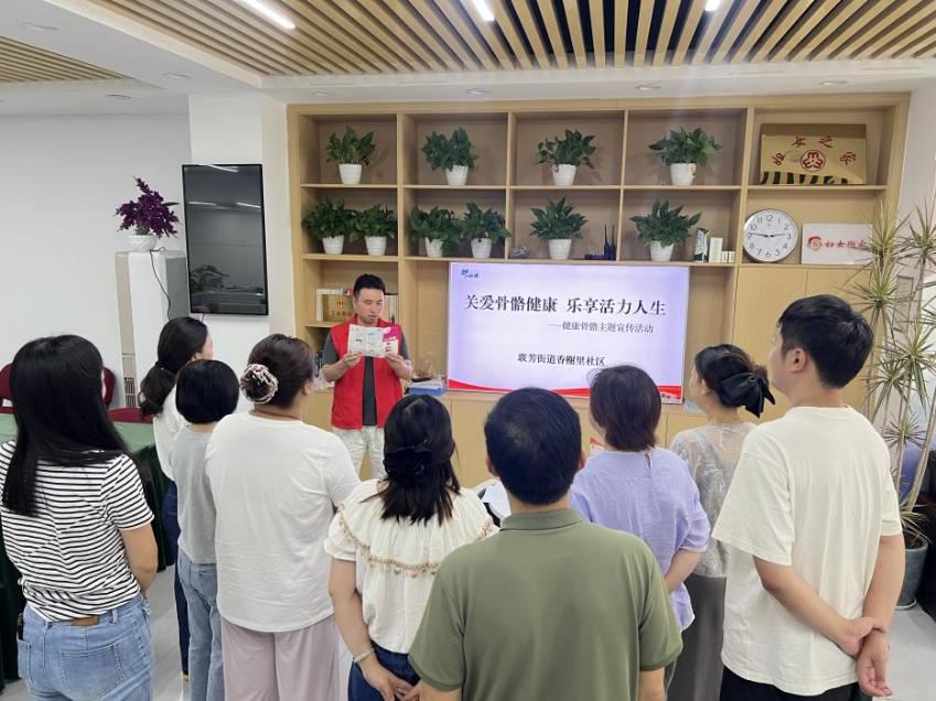 7567 次浏览 10-29为普及骨骼健康知识,提升居民骨质疏松防治意识,近日,联芳街道香榭里社区组织开展“关爱骨骼健康 乐享活力人生”健康主题宣传活动,吸引众多社区居民参与。活动通过专家讲座、现场互动和健康资料发放等多种形式,